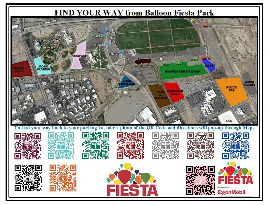 If you forget to drop a pin, not to worry! A map, just as above, is located at the exits of Balloon Fiesta Park. All you need to do is scan the QR Code that matches the name and/or color of the lot you parked in, and you will get directions back to your parking lot.