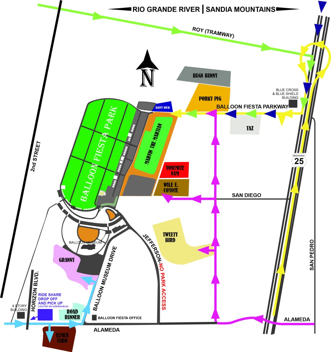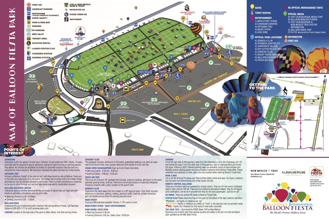 Transportation services to the park include convenient Park and Ride shuttle schedules. Balloon Fiesta public parking sites are also available, and visitors are encouraged to purchase advance admission tickets. Following are links to three versions of the Balloon Fiesta Public Parking Map. Please Note: Routes and assignments are subject to change. We will update these maps should changes occur.