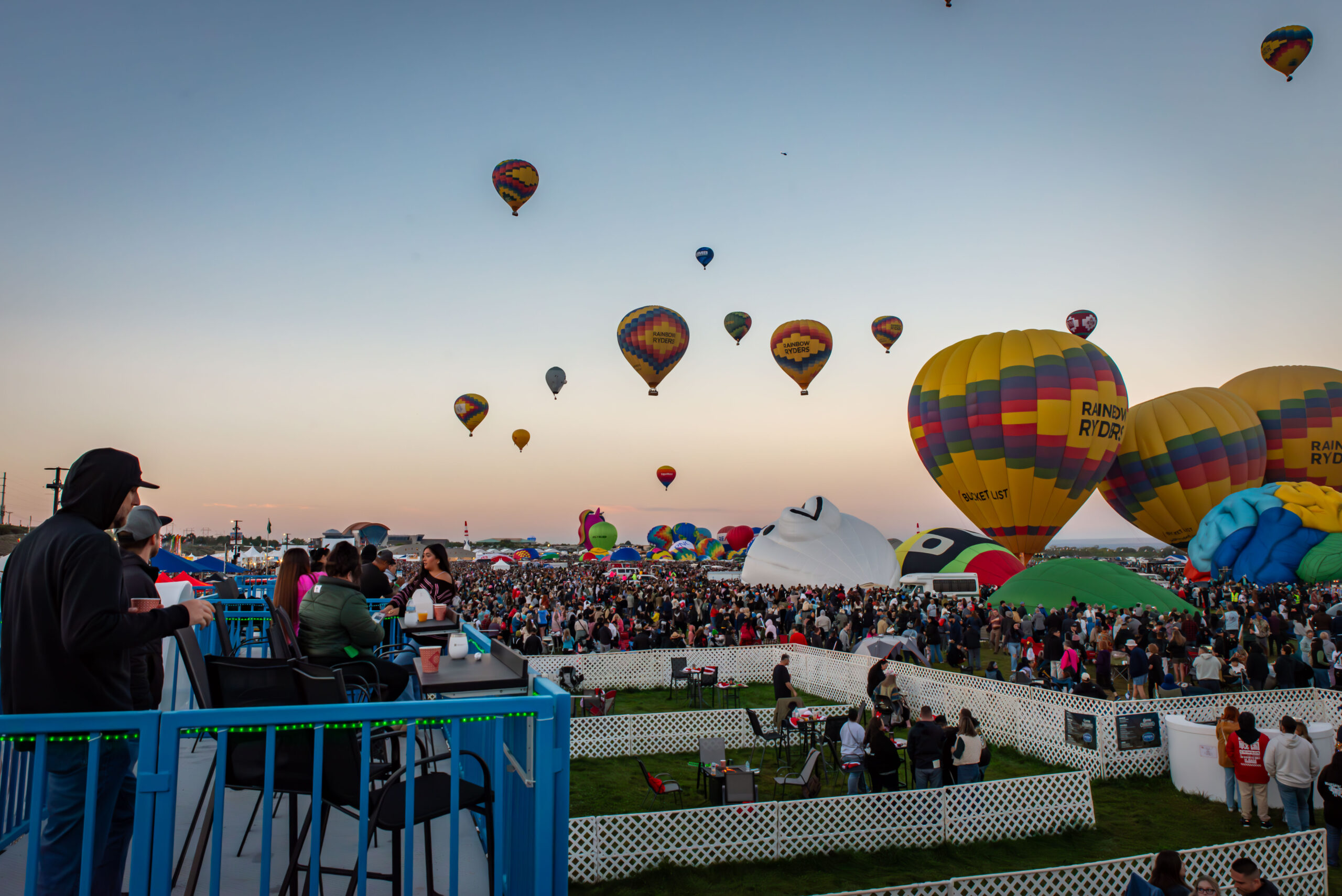 Upper deck seating will put you above the crowd with an unprecedented view of balloons, fireworks, and the drone show. The grassy patio area will have a relaxed vibe where you can enjoy food, drinks, and the largest hot air balloon display in the world.